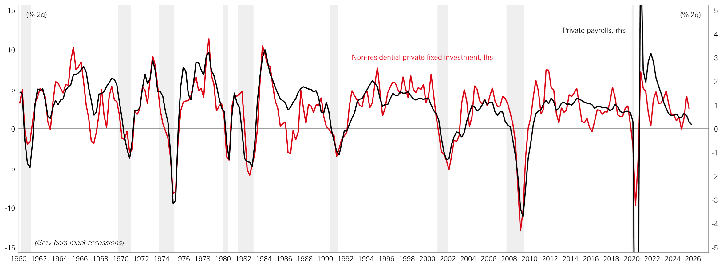Historically, investment and employment have tended to move together, both being a form of corporate spending, but labour-market indicators have softened. Payroll gains slowed through H2 2025, with little private sector jobs growth outside of the healthcare sector.