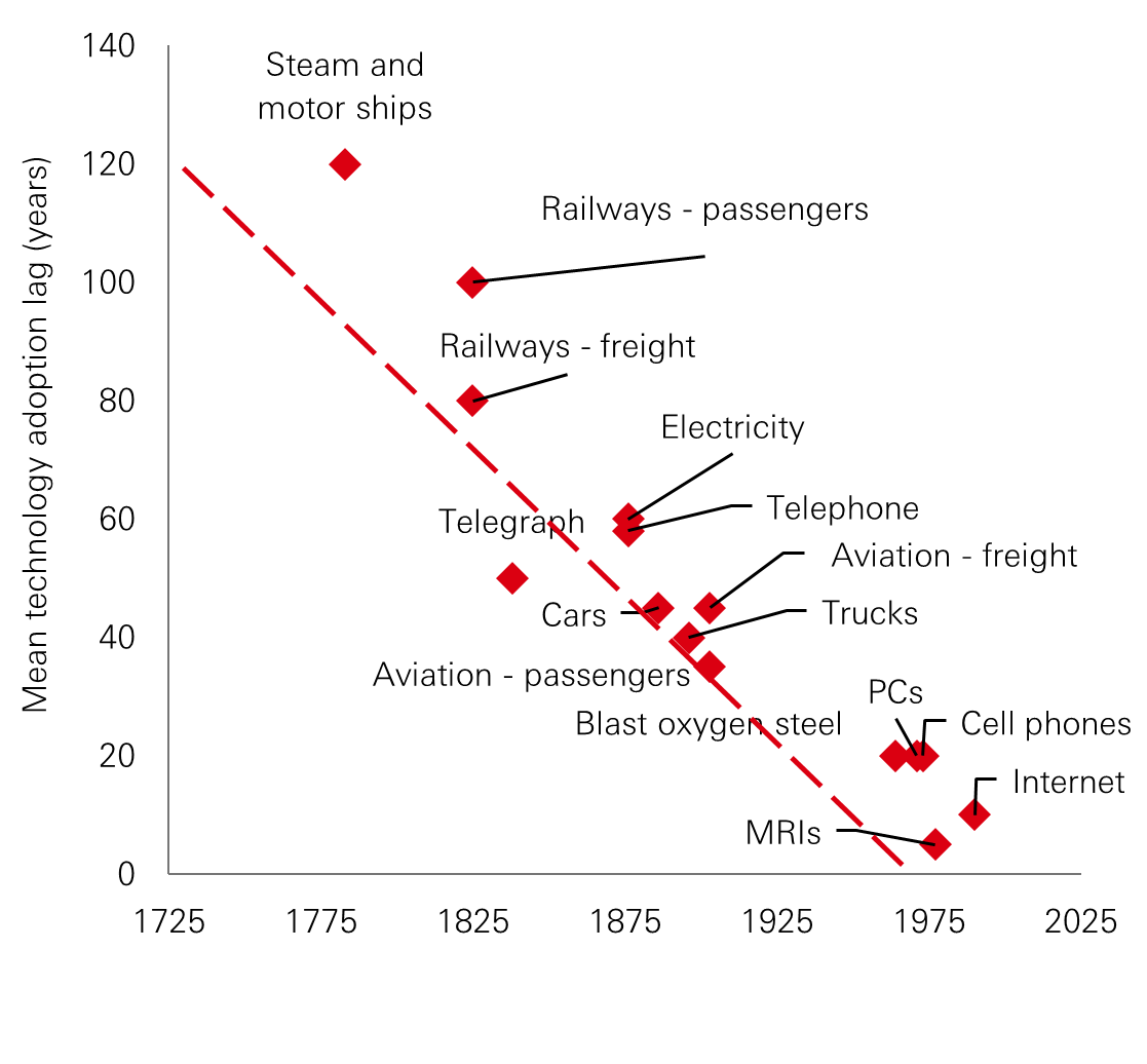 The current cycle nonetheless has some distinctive features. Unlike the dotcom era, the expansion is concentrated among a few incumbents with relative balance-sheet resilience and thus far has been financed primarily through internal cash. This reduces the likelihood of a classic, credit-driven bubble; even if individual assets could eventually be stranded if demand disappoints. The speed of development is also striking, with the adoption of technologies such as the telephone and motorships taking decades; the internet became mainstream in roughly a decade. By contrast, generative AI applications have reached mass user bases within months, supported by existing cloud infrastructure and its clear perceived utility, which reduces some of the purely speculative elements that may have characterised past bubbles.