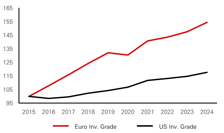 - The Euro credit market has experienced significant growth over the past decade, with the Investment Grade Corporate Index's face value doubling and a 50 per cent increase in issuers. Enhanced sectoral diversity within the market has improved resilience, reducing systemic risks during economic downturns