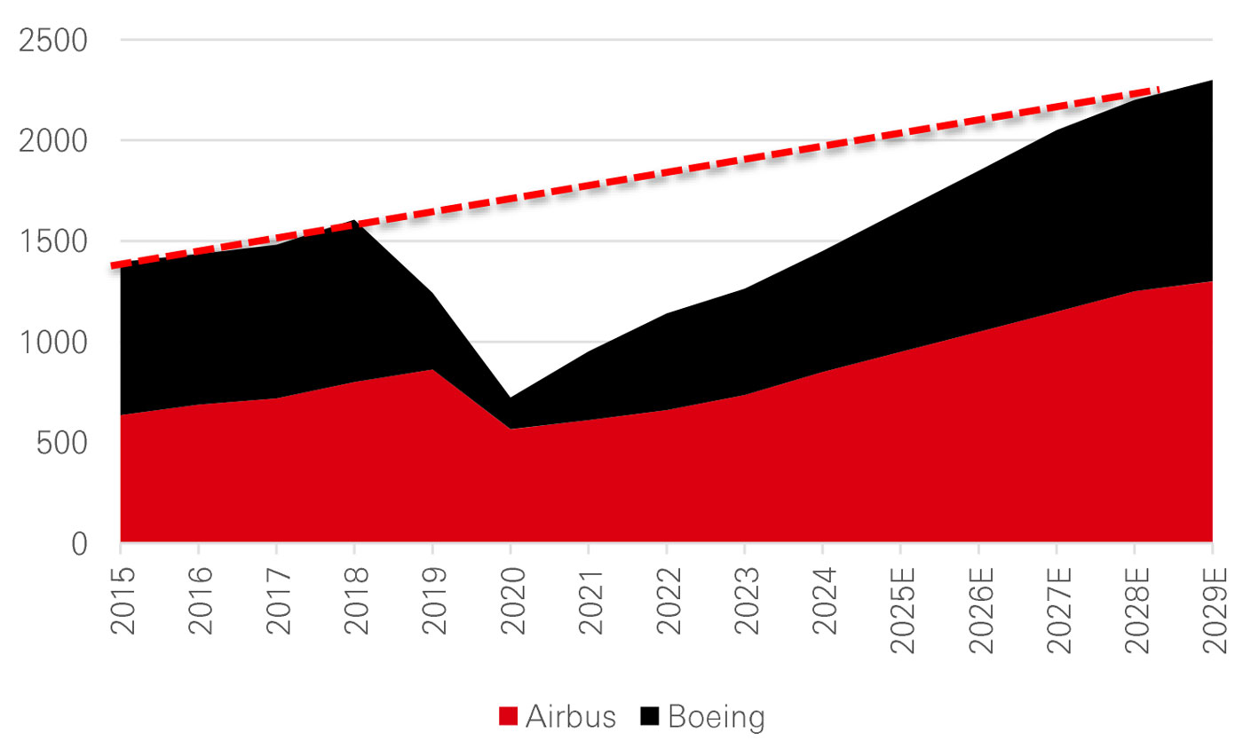 Boeing and Airbus are the main manufacturers of aircraft globally. They have both experienced supply chain challenges, resulting in production rates lagging their full potential. In 2018 these two companies produced approximately 1,500 aircraft, a level which has not yet recovered. Although 2026 looks promisingly close to hitting the previous high watermark, the 6-year period of ‘undersupply’ is unlikely to ever be recovered.