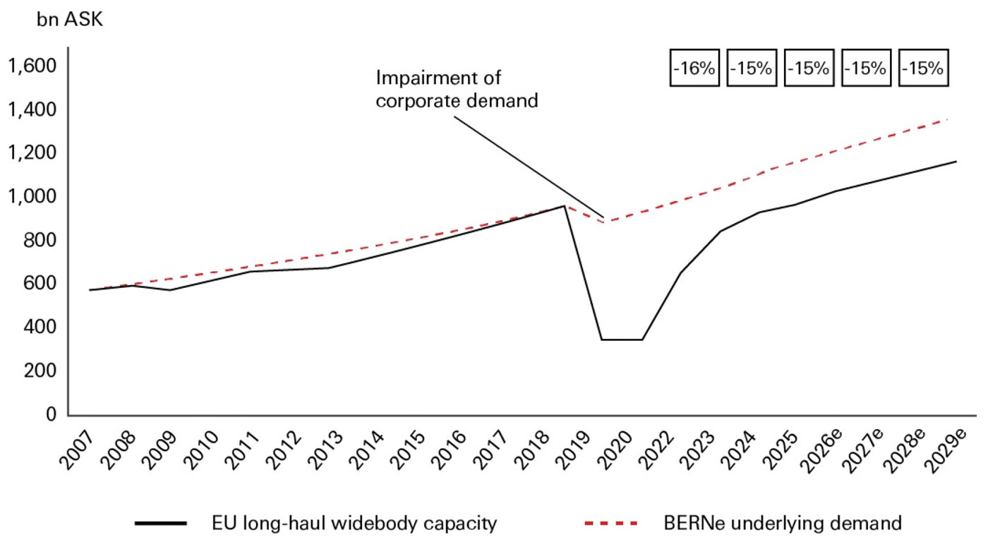 European widebody long-haul capacity is set to continue undershooting structural demand