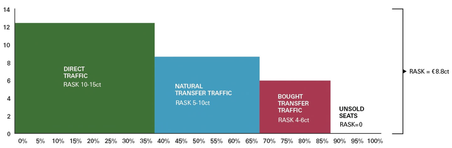 Direct traffic is more profitable than transfer traffic; higher RASK, and lower operating