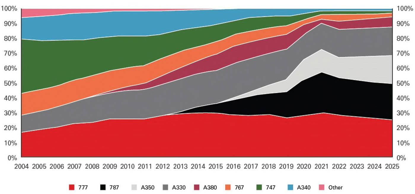 This trend is highlighted by evolution of the European widebody fleet below, showing the growing reliance on Boeing’s 787 and Airbus’ A350 – aircraft which buck the trend of scale economics, carrying 25-45 per cent fewer passengers than the Boeing 747 and Airbus A380, but with considerably lower running costs.
