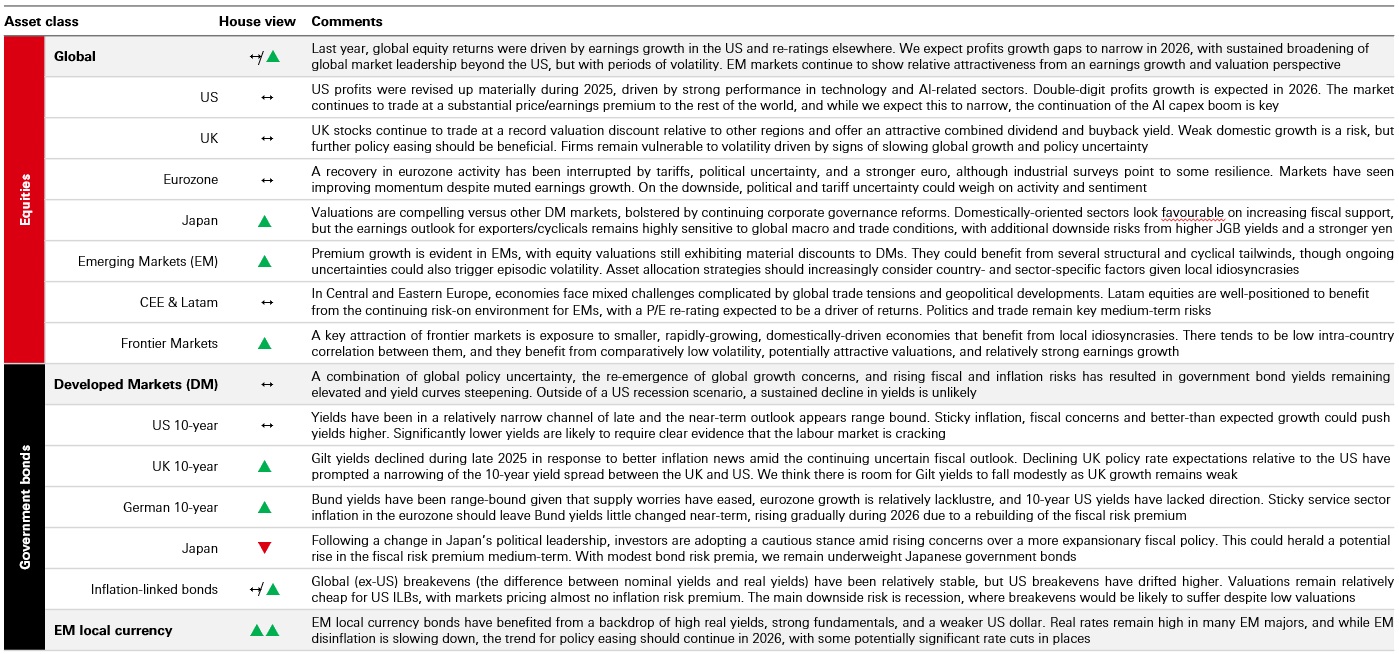 - Views are based on regional HSBC Asset Management Asset Allocation meetings held throughout January 2026, HSBC Asset Management’s long-term expected return forecasts which were generated as at 31 December 2025, our portfolio optimisation process and actual portfolio positions