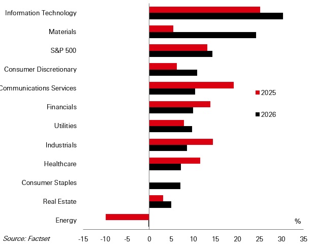 First, is that the S&P 500 is delivering bumper profits again in Q4 2025 earnings season. Year-on-year growth for Q4 was pencilled-in at 8 per cent, but that figure has already risen closer to 12 per cent and could rise further. Among the surprises has been a stellar pick-up in 2026 profits expectations for the Materials sector.