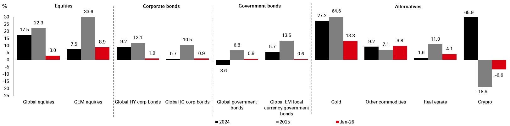 Source: Bloomberg, all data above as at close of business 31 January 2026 in USD, total return, month-to-date terms. Note: Asset class performance is represented by different indices. Global Equities: MSCI ACWI Net Total Return USD Index. Global Emerging Market Equities: MSCI Emerging Market Net Total Return USD Index. Corporate Bonds: Bloomberg Barclays Global HY Total Return Index value unhedged. Bloomberg Barclays Global IG Total Return Index unhedged. Government bonds: Bloomberg Barclays Global Aggregate Treasuries Total Return Index. JP Morgan EMBI Global Total Return local currency. Commodities and real estate: Gold Spot $/OZ, Other commodities: S&P GSCI Total Return CME. Real Estate: FTSE EPRA/NAREIT Global Index TR USD. Crypto: Bloomberg Galaxy Crypto Index.