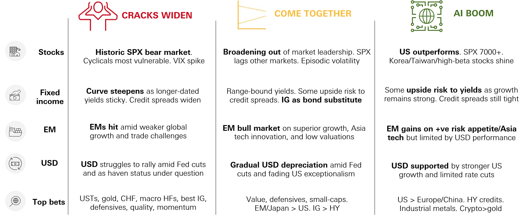 - We expect a “role reversal” this year in areas of the macro, policy, and market environment, with US exceptionalism fading, and growth converging in the west. Global market performance will be dependent on profits growth