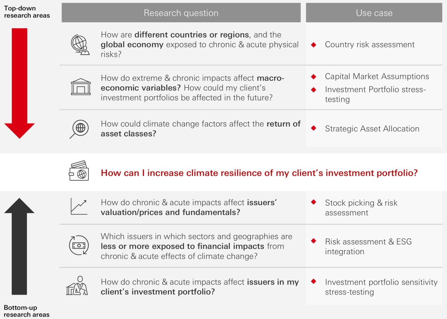 • Top-down research: This approach focuses on the macro-level impacts of climate change on the global economy, individual countries, or asset classes. For example, a Macro Strategy or Multi-Asset Team might examine how climate change affects macroeconomic variables and asset class returns. A macro strategist could ask: How does climate change influence macroeconomic variables and, by extension, my clients' investment portfolios? Meanwhile, a multi-asset portfolio manager might inquire: How can I enhance the climate resilience of my clients’ investment portfolios by adjusting asset allocation towards lower-risk assets?